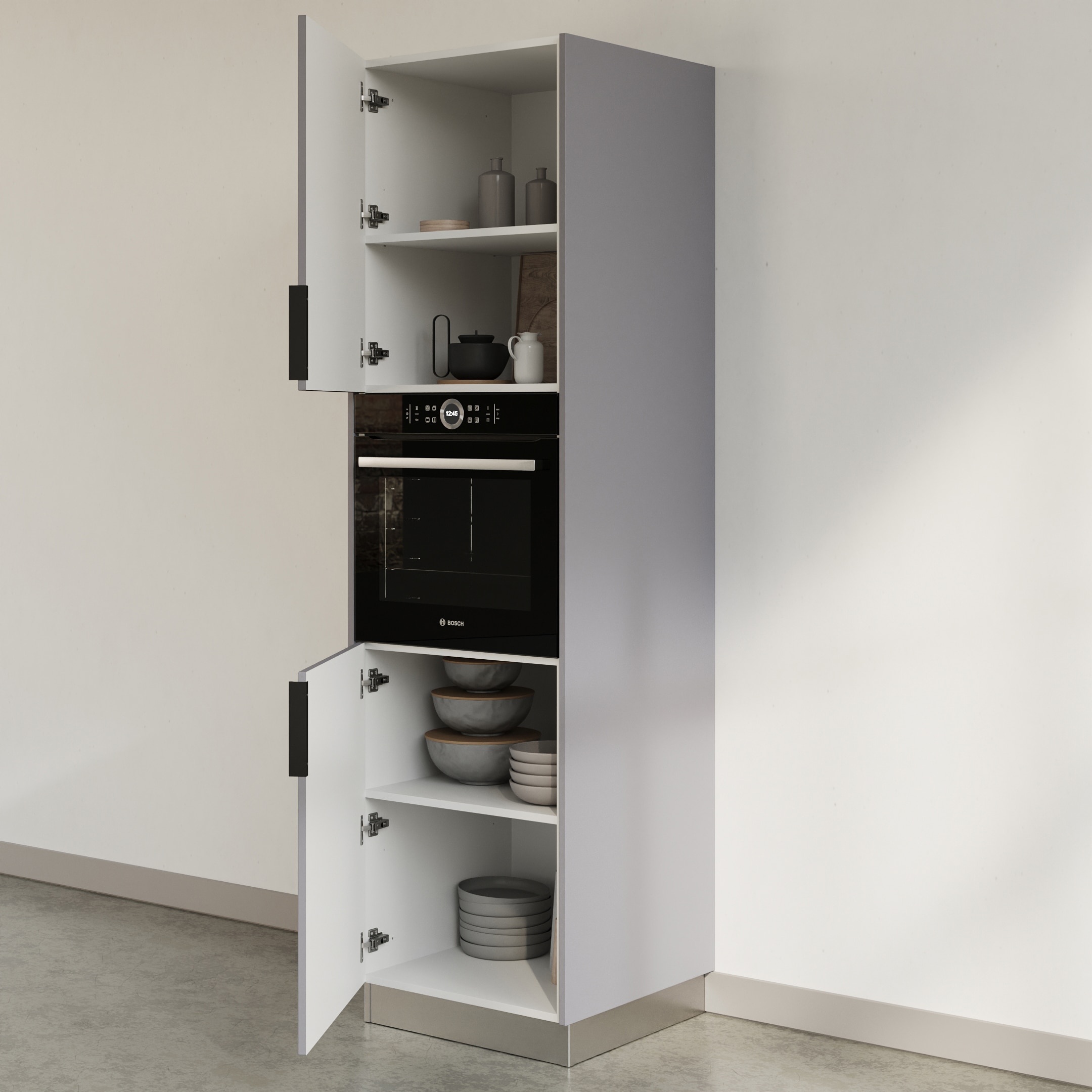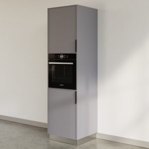 ארון מטבח אידיאלי, ארון לתנור בילט אין מעוצב בקווים נקיים בגימור Soft - Touch מט בגוון אפור עדין, רך ונעים למגע .
