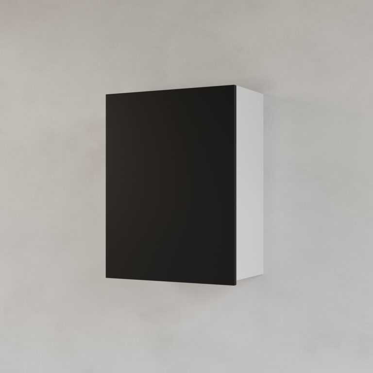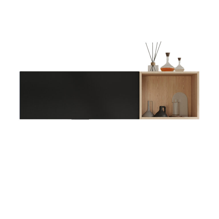 ארון עליון MADERO לאחסון מירבי ומדף מתכת VASIO בצביעה אלקטרוסטטית למראה מינימליסטי ונקי.