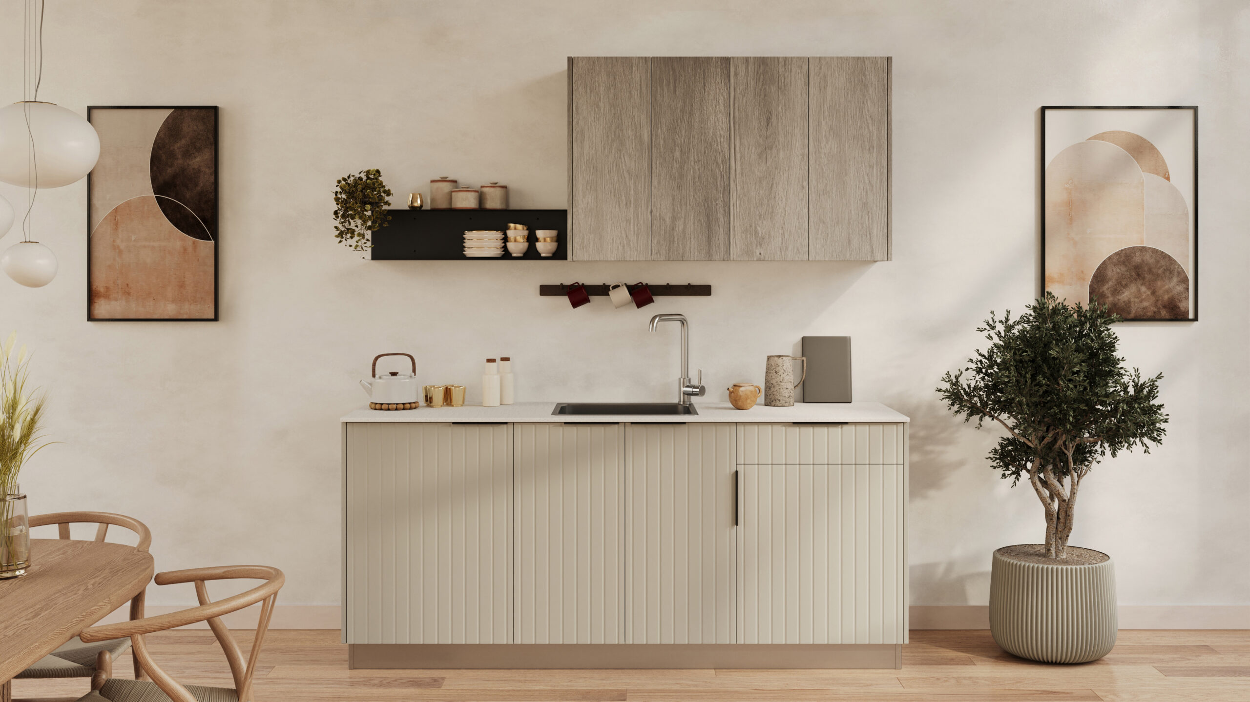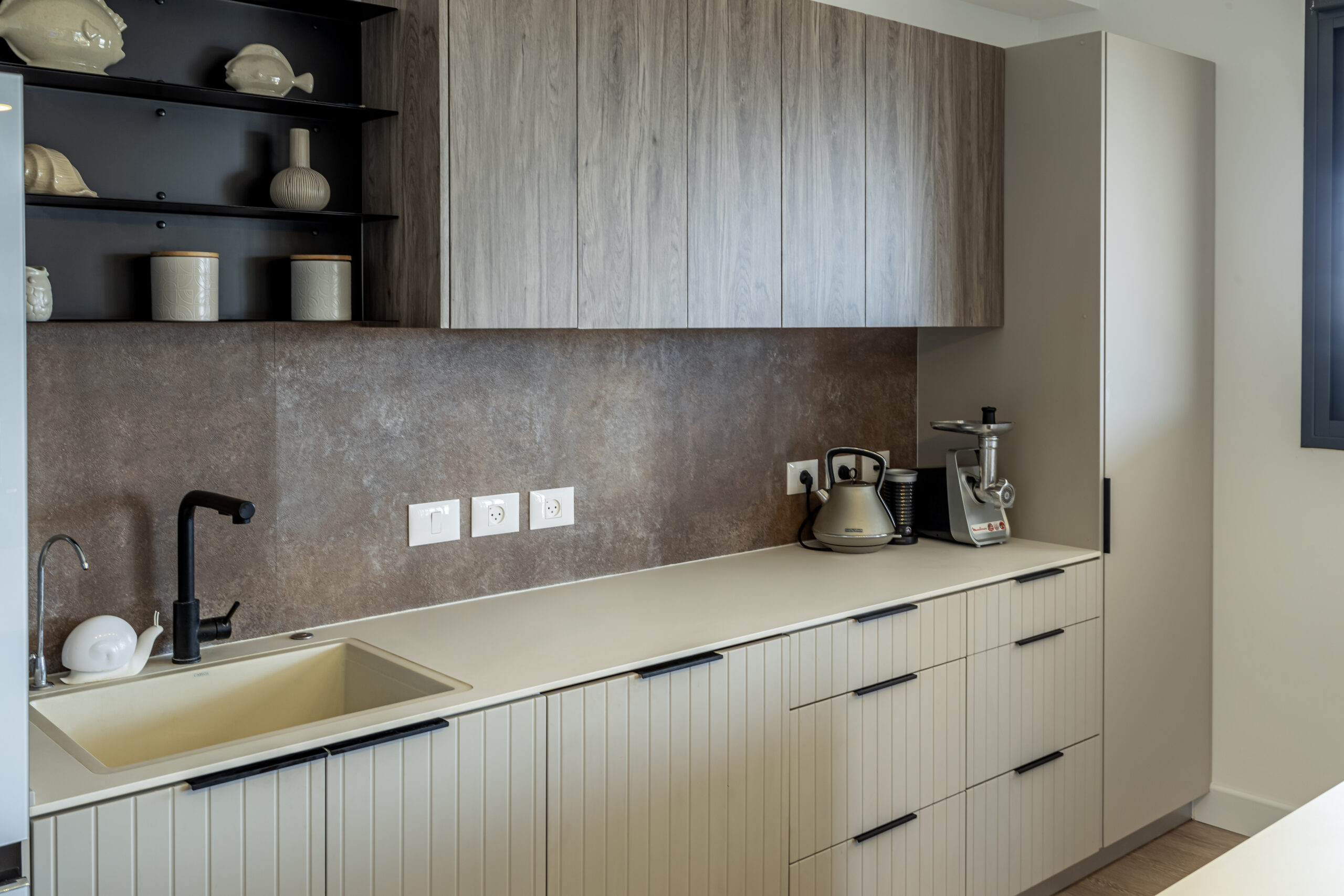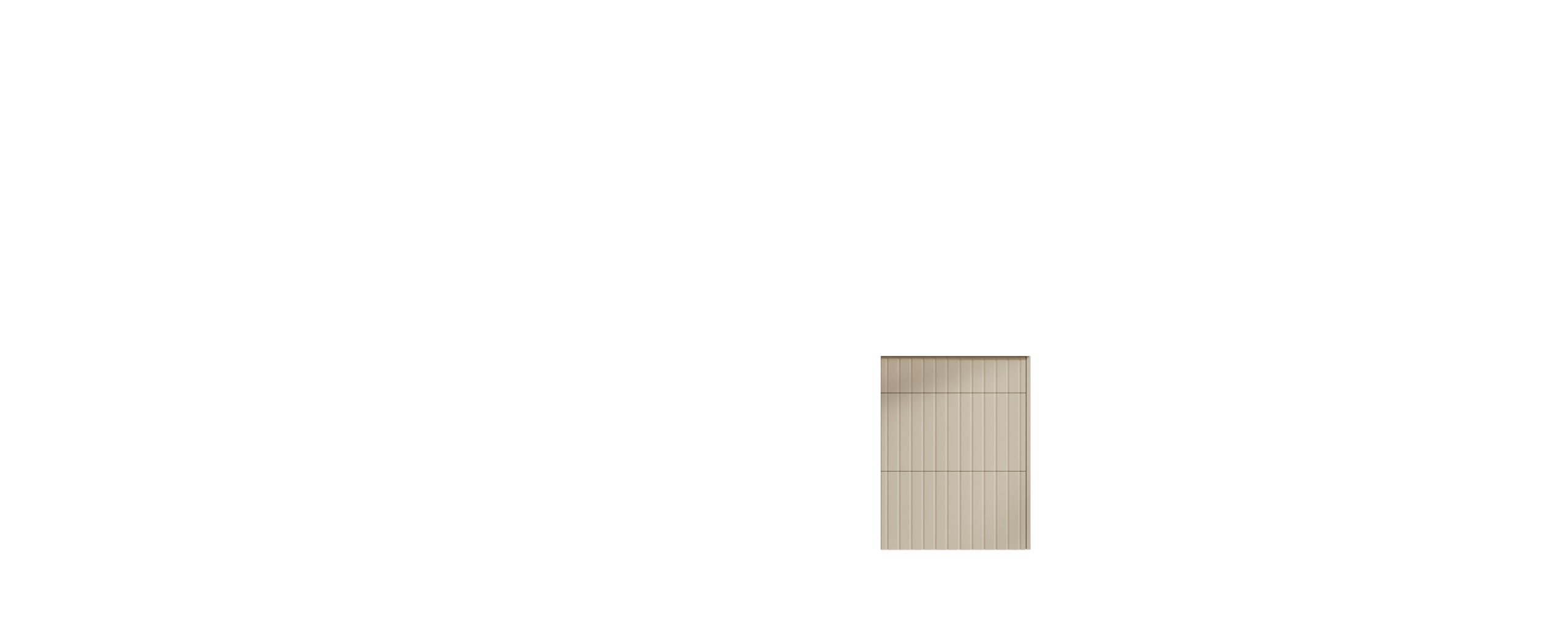 החיבור בין הגוון החמים לעיצוב החזית הופך את המטבח למודרני ונוכח, דוגמאת הפסים האנכיים במקצב אחיד, נשמר לכל אורך המטבח, מאפשר למתבונן להתהפנט במקצב ולהעריך את הדיוק והטקסטורה שנוצרת. ניתן לשלב חזיתות חלקות, באותו הגוון, בארונות עליונים וארונות מזווה ובכך לייצר חווייה עיצובית רחבה יותר